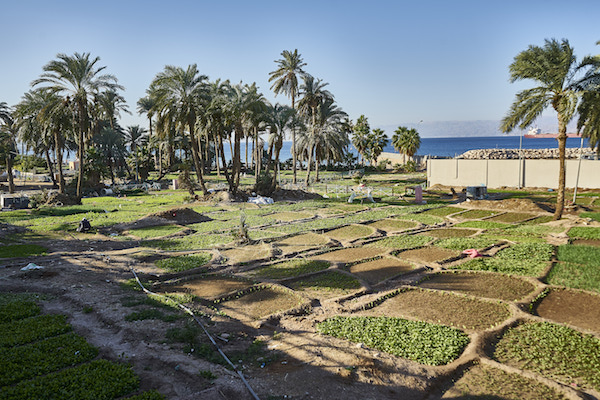 Paseamos por la orilla de la Playa urbana de Aqaba, junto al mar se pueden ver pequeñas huertas urbanas, donde se cultivan lechugas, cebollas, zanahorias, etc.