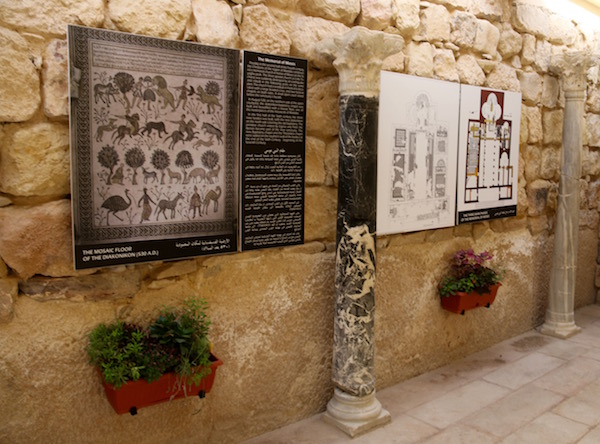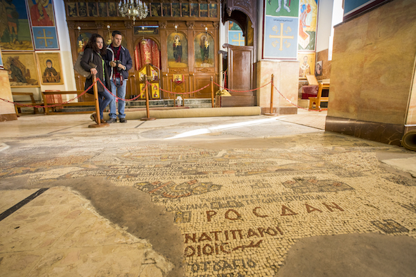 Fuimos a visitar la Iglesia Ortodoxa de San Jorge aquí es donde está el mapa mosaico de Madaba, que se extiende por todo el suelo de la iglesia. Este templo fue levantado en 1896, sobre los restos de una antigua iglesia bizantina, anterior al siglo VI d.C. El panel de mosaicos data del siglo VI, es la representación cartográfica más antigua de Jerusalén, Tierra Santa y el Delta del Nilo, que aún se conserva. Tenía unas dimensiones de 15,6 metros por 6 metros. Actualmente, solo se conserva una cuarta parte del mosaico original. Horario de visitas en invierno de lunes a jueves y sábado de 8:00 h a 17:00 h, los viernes de 9:30 h y los domingos de 10:30 h, en verano de lunes a jueves y sábado de 8:00 h a 18:00 h. La entrada nos costó 1 dinar jordano por persona (1,34 € aproximadamente). La visita nos llevó unos 40 minutos de tiempo aproximadamente. La dirección es King Talal Street.