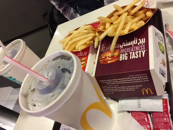 Hicimos una parada para almorzar, esta vez elegimos el Mc Donald donde almorzamos una hamburguesa acompañada de bebida y patatas. Pagamos un total de 8 dinares jordanos (10,66 € aproximadamente). Abierto a partir de las 12:00 h hasta las 23:59 h. La dirección es King Husssein St, Aqaba.