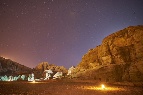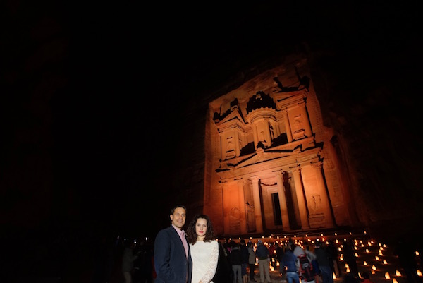 Comenzaba a anochecer, abandonamos el lugar para seguir el camino hasta llegar al Hotel La Mansión, en Petra, donde nos alojaríamos. La dirección es Tourism Stret, Petra, Wadi Musá. Llegamos hicimos el check-in, nos dimos una ducha, cenamos unas frutas. Nos fuimos al centro de visitantes, para comprar la entrada para visitar Petra de Noche. El ticket nos costó 17 dinares jordanos por persona (22,74 € aproximadamente). Está actividad solo se realiza los lunes, miércoles y jueves. Tiene una duración de 2 h, aproximadamente. El recorrido comienza en el centro de visitantes se va acompañado con un guía beduino de la zona, donde va dando una pequeña explicación en inglés adentrándonos por el desfiladero hasta llegar a la Puerta del Tesoro, donde nos sentamos en unas alfombras que había colocado y pudimos contemplar Al Khazna (el tesoro) iluminado por velas que había colocadas en el suelo. Acompañado de una actuación de música local. Nos sirvieron un té. Fue increíble poder contemplar el lugar a la luz de las velas. Si tenéis la posibilidad de visitarlo os lo recomendamos a nosotros nos encantó. Una vez acabado, comenzamos el camino de regreso, estábamos agotados, había que reponer fuerzas, mañana era un gran día visitaríamos Petra de día.