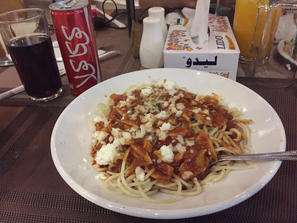 Regresamos al hotel, nos dimos una ducha y bajamos a cenar a la calle de los restaurantes. Entramos en el Restaurante Red Cave Restaurant, donde nos comimos una ensalada de entrante, un plato de pasta, de bebida, una coca-cola y zumo de naranja. Pagamos un total de 20 dinares jordanos (26,62 € aproximadamente).