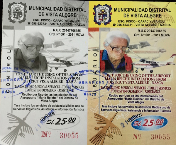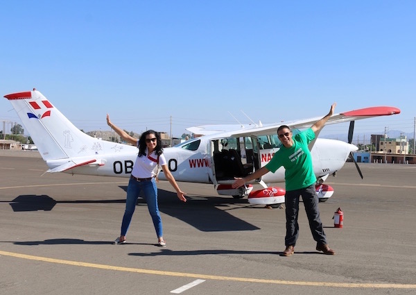 Hoy madrugábamos bastante, el desayuno lo hicimos algo ligero (se aconseja no llevar el estómago muy llenó) porque teníamos un vuelo contratado para sobrevolar las Líneas Misteriosas de Nasca. Es la mejor manera de poder contemplarlas, desde el aire. Vinieron a recogernos al hotel para trasladarnos al aeródromo, está a 4 km del centro de Nasca. Llegamos, nos identificamos con el pasaporte y pagamos el impuesto aeroportuario que fueron 25 soles por persona (6,63 € aproximadamente).