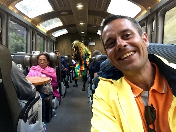 Nos dirigimos a pasar el control y subir al tren, tomamos nuestros asientos y caímos rendidos, estábamos muy alegres, habíamos pasado un día genial descubriendo una de las 7 Maravillas del Mundo Moderno. La sonrisa y alegría se podía ver en nuestras caras, bueno creemos que en todas las personas que íbamos en el tren. Cuando llevábamos un rato de camino nos apareció de repente en el pasillo del tren un chico joven disfrazado, no sabe si quería representar un arlequín, payaso, animal mitológico, etc. no sabemos lo que representaba realmente, hay que echarle un poco de imaginación. Iba sacando a bailar a la gente con una música de fondo de danzas tradicionales de Perú. Después de 1 h y 30 minutos.