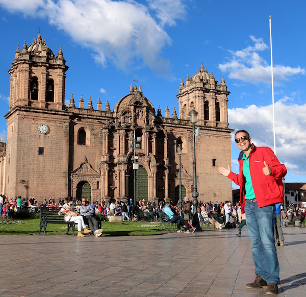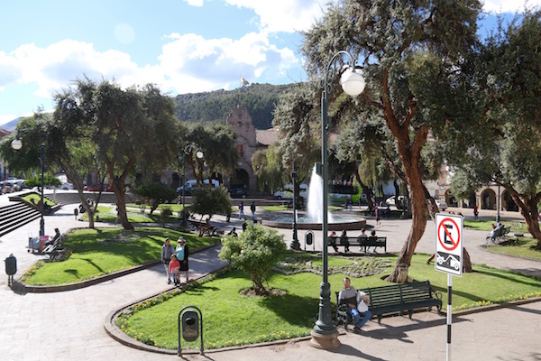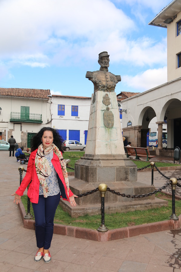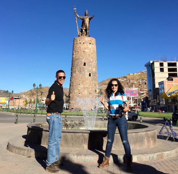 Nuestra primera visita fue la Plaza de las Armas, también llamada la plaza del Guerrero en tiempos de los incas. Este lugar ha sido testigo de importantes sucesos históricos: como la conquista de Cusco por Francisco Pizarro, o de la muerte de Túpac Amaru II en el año 1781. La plaza cuenta con zonas verdes llenas de plantas, bancos, está presidida por la fuente del Inca, que contiene una escultura del inca Pachacuteq, y rodeada de edificios importantes como: la Catedral de Cusco, la Iglesia de la Compañía Jesús y lugares de ocio, tiendas, bares, restaurantes, cafeterías, etc.
