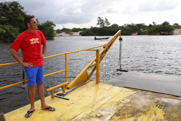 Contratamos una excursión de 4×4, nos montamos en el vehículo con más personas, llegamos hasta el lugar donde embarcamos (el 4×4 y nosotros) en una plataforma para poder cruzar el río Preguiças. Es la única forma de poder hacerlo, ya que no existen puentes o carreteras que lo comuniquen. Una vez cruzado el río iniciamos un trayecto por un sendero de arena que nos llevó a la entrada del Parque Nacional de los Lençois Maranhenses.