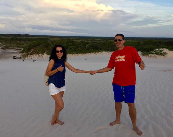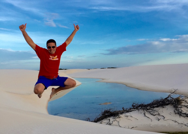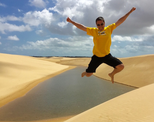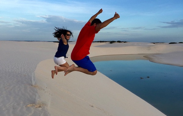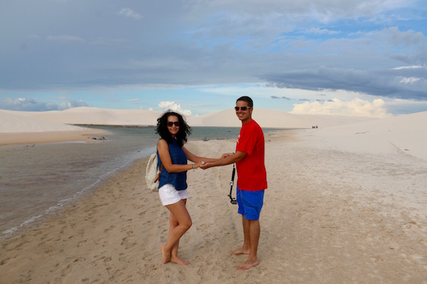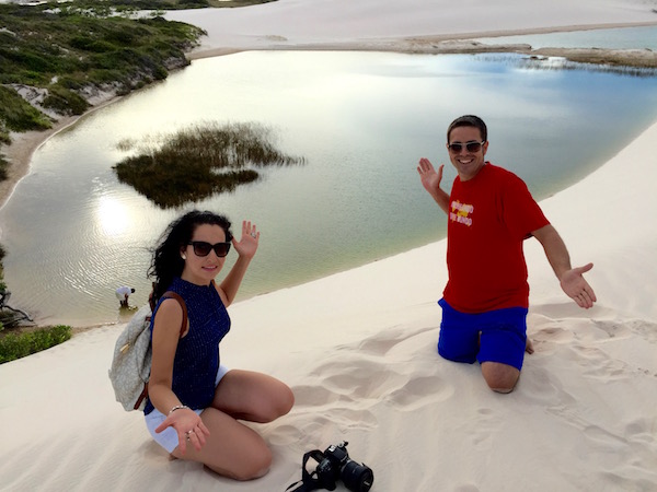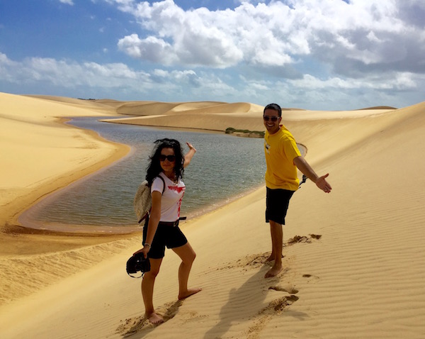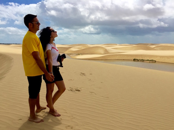 Desde aquí comenzamos una excursión a pie por las dunas, donde vimos la Laguna Azul, Laguna Bonita, Laguna de Peixe, etc. Este desierto cuenta con decenas de lagunas, atravesado por el río que se desliza entre manglares y palmeras para llegar hasta el mar. Fue increíble poder ver y andar por este lugar, esta tarde la disfrutamos en cantidad. Bueno, hasta tuvimos unas pequeñas gotas de lluvia que nos caían desde el cielo, se agradecían. Es cierto que hacía calor, pero no era muy fuerte, aconsejamos llevar agua, crema solar, ropa ligera, gafas de sol, etc.