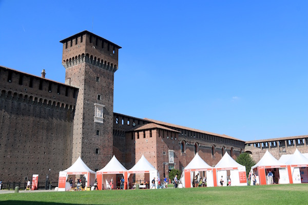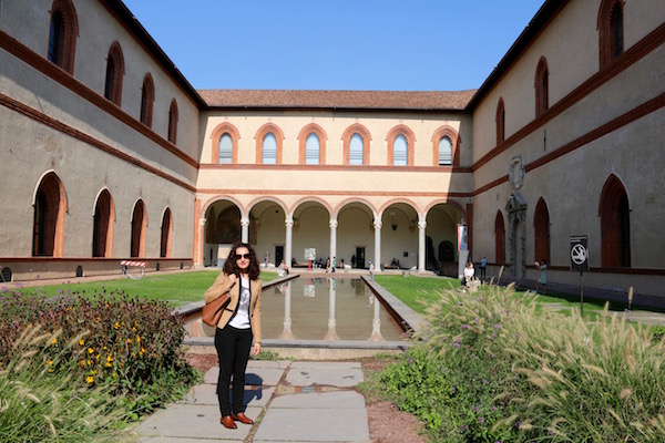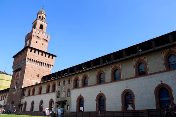Llegamos hasta el Castillo Sforzesco construido como una fortaleza durante el siglo XIV. Hoy en día en su interior alberga algunos de los más importantes museos de la ciudad como: el Museo de Prehistoria y Protohistoria, el de Artes Decorativas, el de Arte Antiguo, la Pinacoteca, el Museo de la Piedad Rondanini, etc. La entrada al patio central del castillo es gratuita, para los museos hay que pagar 5 € por persona, pero los martes a las 14:00 h, de miércoles a domingo a las 16:30 h, el primer domingo de cada mes hasta el mes diciembre de 2016, es gratuita. Nosotros cuando lo visitamos había una feria llena de exposiciones donde podías encontrar de toda moda, belleza, cultura, etc. El castillo está abierto todos los días de 7:00 h a 19:30 h. Los museos de martes a domingo desde las 9:00 h hasta las 17:30 h. La dirección es Plaza Castello.