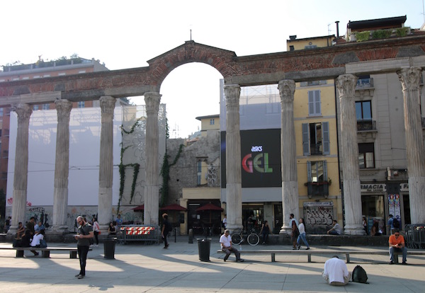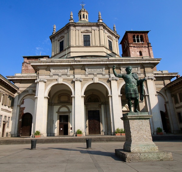 Anduvimos hasta llegar a la Via Cusani donde tomamos el tranvía hasta llegar a la Vía Torino, bajamos, andamos a pie unos metros hasta llegar a la Basílica San Lorenzo Maggiore edificada en el siglo IV, es el templo más antiguo de Milán. En el interior se puede ver la capilla de San Aquilino. La entrada es gratuita, para acceder a la Capilla de San Aquilino hay que pagar 2 € por persona. Horario de visitas de lunes a sábado de 8:00 h a 18:30 h, domingos de 9:00 h a 19:00 h. La dirección es Corso di Porta Ticinese 39.