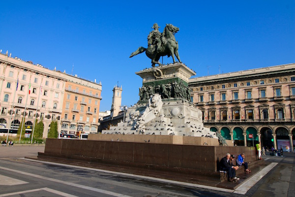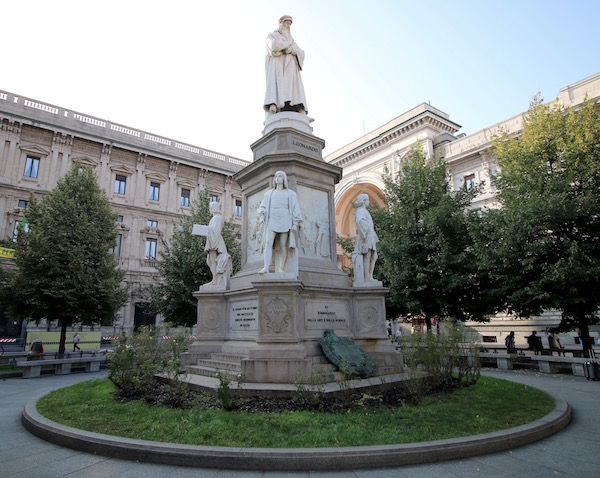 Salimos de la galería Vittorio Emanuele II y encontramos la Plaza de Scala presidida en el centro por la Estatua de Leonardo da Vinci.