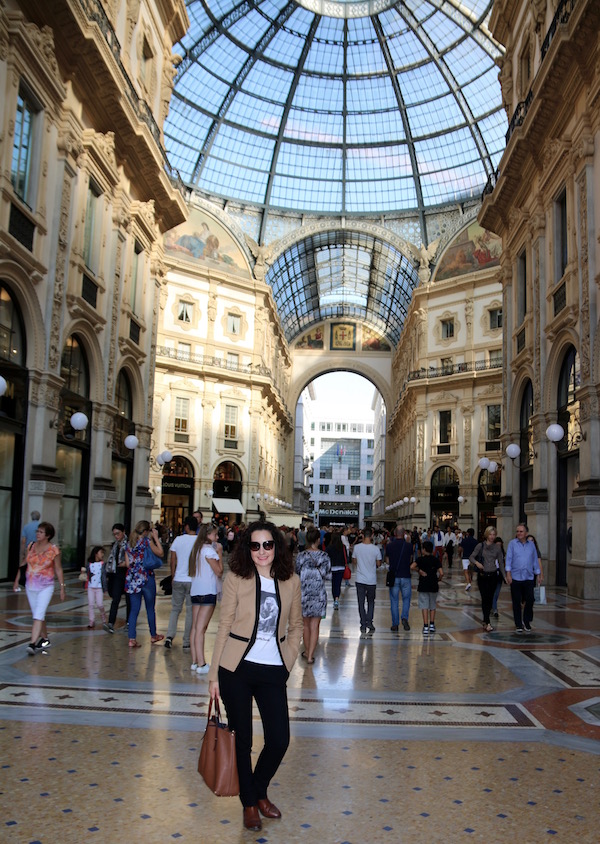 Nos adentramos en la Galería Vittorio Emanuele II es una zona comercial llena de tiendas, bares, restaurantes, etc…, donde pudimos ver las más prestigiosas tiendas de moda y elegantes de la ciudad. Fue diseñada en el siglo XIX, formada por dos arquearías perpendiculares cubiertos por una bóveda de hierro y vidrio. Se sitúa entre la Plaza del Duomo y la Plaza della Scala.