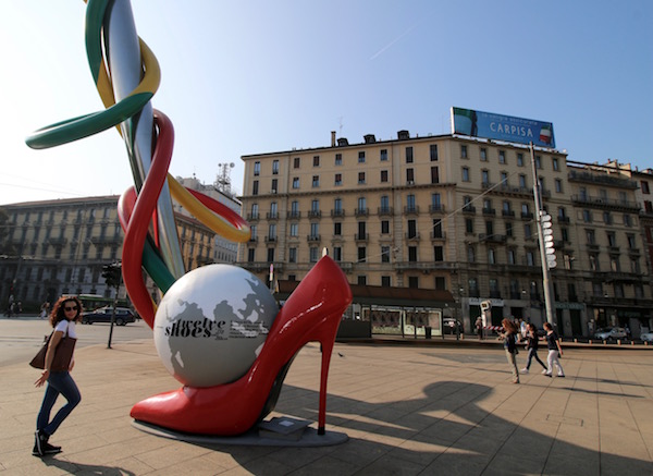 Nos levantamos a las 7:30 h bajamos a desayunar al comedor, una vez terminado nos fuimos a la parada de autobús para tomar el autobús que nos llevaría hasta la Plaza Cadorna presidida por la escultura de la aguja, el hilo, el nudo que hace mención a la moda, también hay una bola del mundo colocada sobre un zapato de tacón.