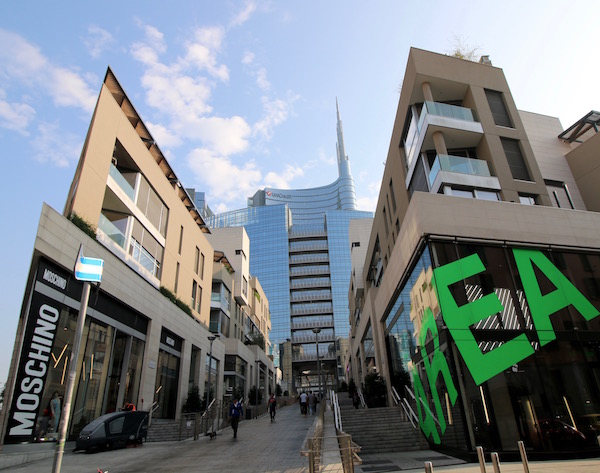 Llegamos la Plaza Gae Aulenti inaugurada en el año 2012 diseñada por el arquitecto Cesar Pelli, es la zona más moderna de Milán rodeada de edificios con unos diseños muy modernos, elegantes, sorprendentes. Pudiendo destacar el edificio Unicredit Tower con una altura de 231 metros, es el rascacielos más alto de la ciudad, también llama la atención el Bosque Vertical, son dos torres recubiertas por una gran cantidad de plantas. Está rodeada de tiendas, bares, restaurante, cafeterías, etc.