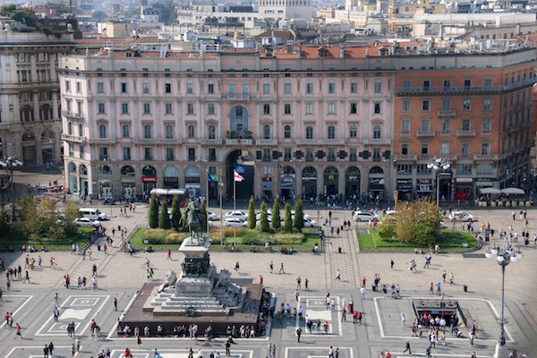 Ahora sí, una vez acabamos de almorzar, comenzamos a explorar la Plaza Duomo es la plaza principal y es el centro de la ciudad. Tiene una forma rectangular con una superficie de 17000 m², fue creada en el siglo XIV, con el paso de los siglos se ha ido ampliando y restaurando. Nos dimos un paseo, en este lugar se encuentra una escultura en bronce donde aparece la imagen del rey Víctor Manuel II, montando a lomos de un caballo, la catedral o Duomo, hoy no iríamos a visitarla, ya que a las 18:00 h, cierran las taquillas de venta de entradas. Queríamos hacer una visita extensa, porque el lugar merece la pena, dejaríamos la visita para la mañana siguiente y podríamos disfrutar más de ella. Pero bueno, tomamos unas fotos desde el exterior.