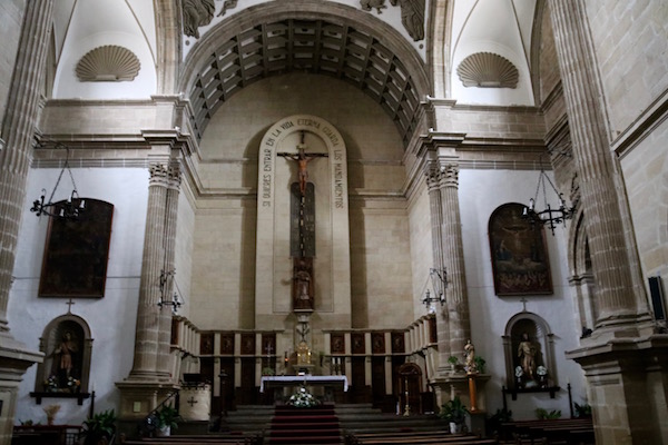 La Colegiata de Santa María de los Reales Alcázares, en ella se han hallado restos de la Edad de Bronce, templo romano dedicada a la Diosa Diana e incluso fue una mezquita árabe. Tras ser conquistada Úbeda por el rey Fernando III, el santo en 1233, la mezquita fue transformada en iglesia Mayor. Es un templo católico de estilo gótico mudéjar compuesto por cinco naves sobre columnas cuadradas, teniendo capillas góticas. El templo se vio cerrado en 1983 debido a la inclinación de los pilares. Su restauración duró 28 años. Su claustro es del siglo XV, las capillas nobiliarias son de los siglos XV y XVI. Fue declarada Monumento Nacional en 1926 y parte del conjunto Patrimonial de la Humanidad declarado en 2003, siendo la iglesia principal de Úbeda y la tercera de la diócesis de Jaén. La entrada nos costó 4 € por persona con audio guía, el ticket reducido para jubilados y grupos de más de 20 personas tiene un coste de 2,50 € cada uno. La entrada para niños y visitas especiales tiene un coste de 1,50 €, presentado un documento que lo acredite. Horario de visitas del 1 de enero al 31 de marzo, los lunes de 16:00 h. a 18:00 h., de martes a sábados de 11:00 h. a 14:00 h., por la tarde de 16:00 h. a 18:30 h., los domingos de 11:00 h. a 14:00 h. Del 1 de abril al 4 de mayo, los lunes de 17:00 h. a 19:30 h., de martes a sábados de 11:00 h. a 14:00 h., por la tarde de 17:00 h. a 19:30 h., domingos de 11:00 h. a 14:00 h. Del 5 de mayo al 8 de septiembre, de lunes a sábados de 10:00 h. a 14:00 h., por la tarde de 17:00 h. a 20:00 h., los domingos de 11:00 h. a 14:00 h., por la tarde de 17:00 h. a 20:00 h. Del 9 de septiembre al 31 de diciembre, los lunes de 16:00 h. a 18:30 h., de martes a domingos de 11:00 h. a 14:00 h., por la tarde de 16:00 h. a 18:30 h., los domingos de