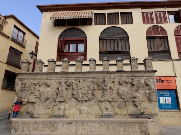 Cambiamos la dirección y andamos unos metros y justo enfrente del paseo de los Álamos se encuentra la Fuente Pilar de los Álamos fue diseñada en piedra arenisca en 1552 en estilo renacentista, en ella se puede ver tallado el escudo de la ciudad, cuenta con cuatro caños y el pilar es un abrevadero.