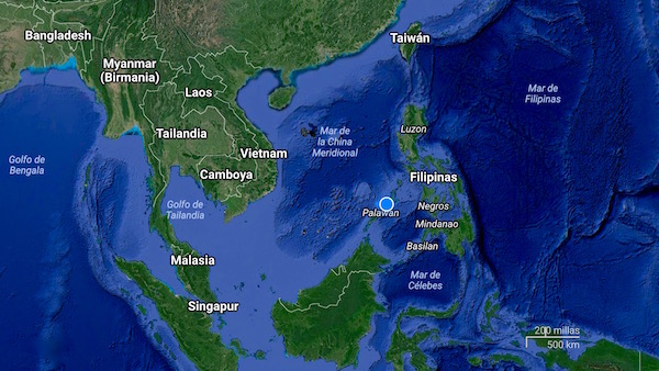 La provincia de Palawan se encuentra en el suroeste de Filipinas. La isla principal de Palawan posee 40 km de ancho y 425 kilómetros de largo. La capital es Puerto Princesa, situada en la parte central de la isla de Palawan, se localiza a unos 500 kilómetros de la capital de Manila. Palawan es considera como la última frontera de Filipinas.