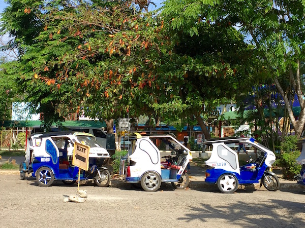 Aterrizamos en el Aeropuerto Internacional de Puerto Princesa, recogimos el equipaje y salimos del aeropuerto. A la salida hay una gran cantidad de tuk tuk, son unas motos taxis que hacen traslados por la isla. Dependiendo de la zona hay una tarifa, al lado de estos vehículos podrás ver una tabla de precios, son muy económicos. Pero os aconsejamos que lo fijéis, habléis un precio con ellos, para luego no sufrir ninguna sorpresa ¡Recuerda!, llevar cambio de dinero, porque pueden decirte que no tienen cambio y se quedaran con la vuelta.