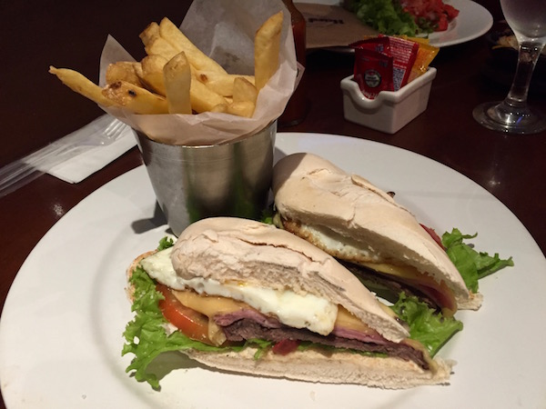 Allí hicimos una escala de 2 h y 45 minutos, nos encontrábamos en la terminal A, decidimos almorzar en el Restaurante Hard Rock Café, era el mejor restaurante que había en la terminal, los otros eran cafeterías, ventas de bocadillos fríos, bollerías, refrescos, etc. Pedimos un plato de pajitas con pollo y para el otro un bocadillo de lomito, de bebida una botella de agua sin gas y una coca cola. Al precio de la comida tuvimos que añadirle un 5% de comisión por el servicio prestado que no estaba incluido. Como podéis comprobar los locales más internacionales y más famosos del país, hay que añadirle las propinas. Pagamos un total de 675 pesos argentinos (33,27 € aproximadamente).