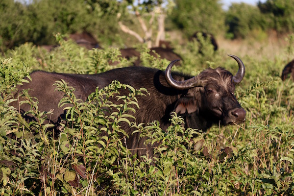 Cogimos un camino, giramos a un lado, a otro y nada de nada, simplemente nos encontramos con otro 4×4, que estaba como nosotros ¡buscando animales!, un pájaro en el suelo había, y el último de los cinco grandes que nos faltaba, ¡Hay estaban!, los búfalos cafre. Este es un mamífero de la familia bovidae, un macho adulto puede llegar a pesar hasta 900 kilos, en cambio, las hembras son más pequeñas que los machos, tienen una longitud de 200 a 340 metros, y una altura de 1,20 a 1,70 cm. Su pelaje es oscuro, siendo escaso, pero tienen sobre las orejas y en la punta de la cola. Se alimenta de hierbas, hojas, etc., son muy buenos nadadores, vive en rebaños hasta 100 individuos, llegando alcanzar una velocidad de 50 km/h. Las hembras tienen una gestación de 340 días, dando a luz a una sola cría. Los depredadores que tienen son los leones, el cocodrilo del Nilo y el ser humano.