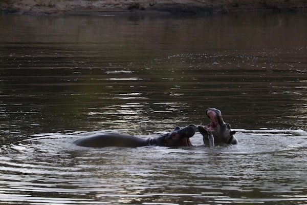 Tocaba el momento de regresar al campamento, era completamente de noche y la temperatura estaba bajando mucho. Aunque Calton, nos dio una manta verde, para que nos abrigáramos cada uno, íbamos congelados. De repente por el camino, paramos, había salido un hipopótamo de una charca a comer hierba. ¡Esto no se ve todos los días!, no nos pudimos acercar demasiado a él, porque son muy agresivos y peligrosos. Aunque tienen un cuerpo muy pesado, son muy veloces, al vernos volvió a adentrarse en la charca.