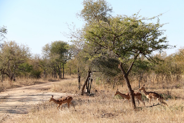 Se nos cruzaron por el camino una pequeña manada de impalas de cara negra, subespecie del impala, antílope africano de tamaño medio, pueden llegar a pesar los machos 65 kg y las hembras 40 kg, tienen una longitud de 90 a 100 cm, su pelaje es de color marrón claro, parte trasera más oscura, el vientre es blanco, solo los machos son los que poseen cuernos que pueden llegar alcanzar 90 cm de largo, habitan en la sabana, son herbívoros se alimentan de arbustos, hierbas, hojas de acacias, etc. Las hembras tienen una gestación que dura entre 195 a 210 días, dando a luz a una sola cría. Realizan saltos llegando alcanzar 10 metros de longitud. Tiene un promedio de vida de 15 años, sus depredadores son leones, leopardos, guepardos, y hienas.