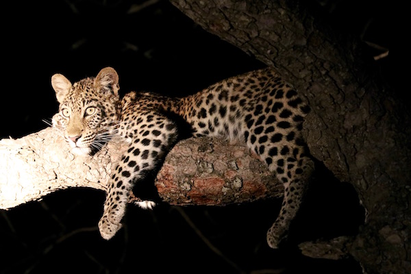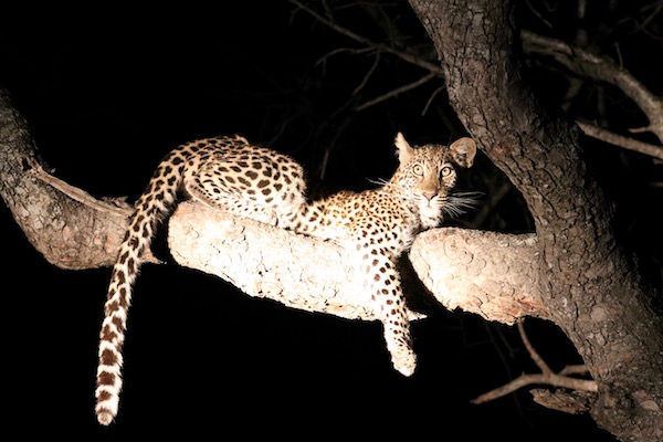 Otra vez nos veíamos como la tarde anterior, ¡nos quedaríamos sin atardecer!, llegamos otra vez tarde, lo pudimos ir contemplando por el camino. Llegamos a la zona, bajamos y tomamos unos refrescos junto con otro grupo de safaris, terminamos y volvimos a subir al vehículo, poniendo dirección a Lodge, los safaris suelen acabar a las 19:00 h tan solo faltaban 10 minutos para que terminase el safari, Calton comenzó a correr demasiado parecía Fernando Alonso, el Ranger iba montado en el capó del vehículo, (algo que solo hemos visto en los 4×4 en Sudáfrica) como siguiera así iba a salir volando por los aires, nosotros nos íbamos golpeando las rodillas con la barra de metal que tenía el vehículo. La señora del brasileño, ¡estaba que mordía! No hacía falta tanto correr, hubiéramos salido un poco antes y no hubiera pasado nada, a Calton le había avisado de que había un leopardo en las ramas de un árbol y no nos dijo nada, nos llevó a la zona y hay estaba el animal, nos pidió disculpas por la conducción. Nos quedamos como bobos mirando al animal, ¡era increíble!, esto no nos lo esperábamos. Los leopardos son animales solitarios, se dejan ver en las ramas de los árboles capaces de llevar a su presa a las ramas de los árboles, a si se la podrán comer más tranquilos sin que le molesten los animales carroñeros como: cuervos, hienas, etc. Se caracterizan por su velocidad y fuerza, el único carnívoro que corre más que ellos, es el guepardo, son muy parecidos físicamente, pero tienen una marca negra en los ojos que van hasta su hocico, que los distingue uno de otros.