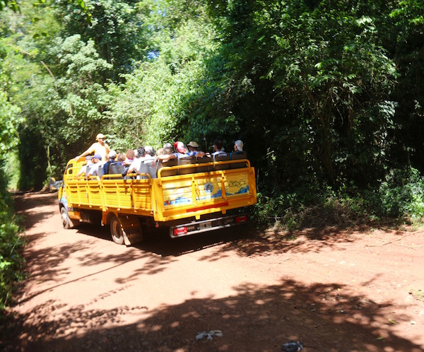 El paseo Náutico, como la anterior actividad, no pudimos realizarla decidimos experimentar el paseo Náutico Gran Aventura tiene una duración de 1 h y 20 minutos. Se sale desde la central operativa o centro de visitantes, nosotros salimos de esta última, subimos en un camión adentrándonos en la selva por el estrecho sendero Yacaratiá acompañados de guías bilingües (castellano e inglés) unos 5 km hasta llegar al puerto Macuco.