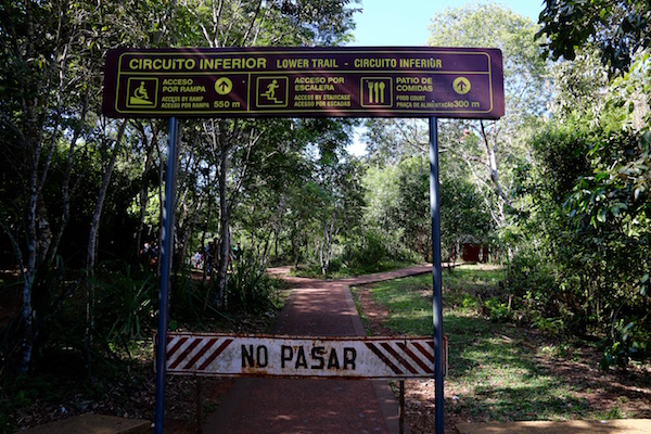 El circuito inferior tiene una longitud de 1700 metros, el recorrido se realiza en 45 minutos aproximadamente. La caminata se lleva acabó por unas pasarelas que se van adentrando en la selva hasta llegar a los saltos Dos Hermanas, Chico y Ramírez. El primer tramo acaba en la caída del Salto Bossetti. Al salir de este salto, a 20 metros se encuentra el embarcadero desde el cual se puede tomar un bote (servicio gratuito) para cruzar a la isla de San Martín. Siguiendo la ruta se va bordeando el brazo del río Iguazú que se aleja de las islas, pudiendo ver sus playas y acantilados. Una vez terminado este segundo recorrido del circuito inferior, se llega al balcón mirador situado en el encuentro del brazo del río con el cañón del Iguazú, aquí se ve la Garganta del Diablo al fondo, con bruma. La etapa tercera y última del recorrido te puede hacer volver a la Plaza Dos Hermanas, hay escaleras que llevan hasta la caída de los Saltos Alvar Núñez, Elenita y la Nusse. Nosotros este sendero no pudimos realizarlo porque llevaba 2 días cerrado al público por haber en la zona un felino (un puma), tomaron medidas de seguridad por parte del parque, y permaneció, cerrado y acordonado el lugar. Por lo que nos quedamos sin poder hacerlo.