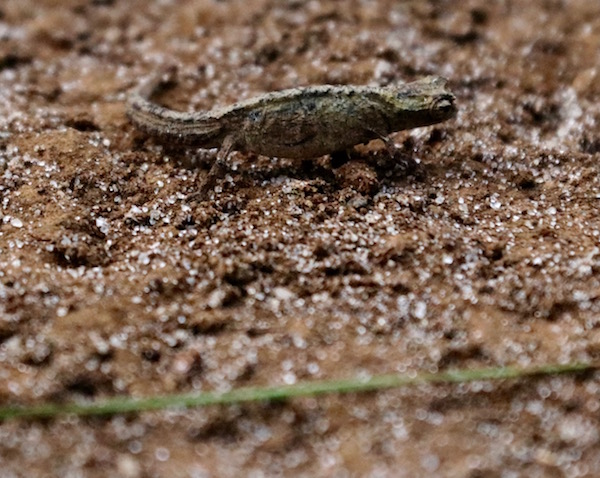 ¡Al fin vimos al esperado camaleón!, el camaleón más pequeño, encontrado en el norte de Madagascar, su nombre científico es Brookesia micra, tiene una longitud total de 26 mm. Para que te hagas una idea, tiene el tamaño de una uña de un humano, es el vertebrado más pequeño, de color pardo con tonalidades verdes, no cambia de color, al no poseer mimetizarse porque vive en el suelo entre las hojarascas de pequeños bosques. Por la noche trepa a lo alto a unos 10 ó 15 cm del suelo. Este camaleón está en peligro de extinción debido a la deforestación.