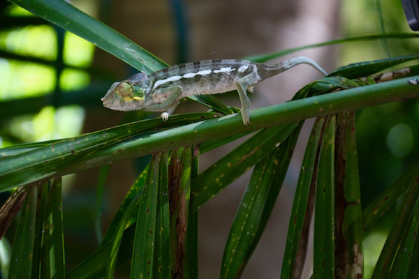 El camaleón pantera esta especie de camaleón, originario de Madagascar, aunque el ser humano lo ha ido introduciendo en otros países del mundo. Es uno de los más grandes, tiene una longitud total, incluyendo la cola de 55 cm los machos, en cambio, las hembras es de 35 cm, ellas viven 3 años, y ellos 6 años. Son diurnos, se alimentan de insectos, son animales ovíparos. Las hembras tienen un color más apagado que los machos, tiene una puesta entre 15 y 50 huevos. De color verde llamativo, tiene bandas verticales rojas y una línea horizontal sobre cada costado de color blanca.