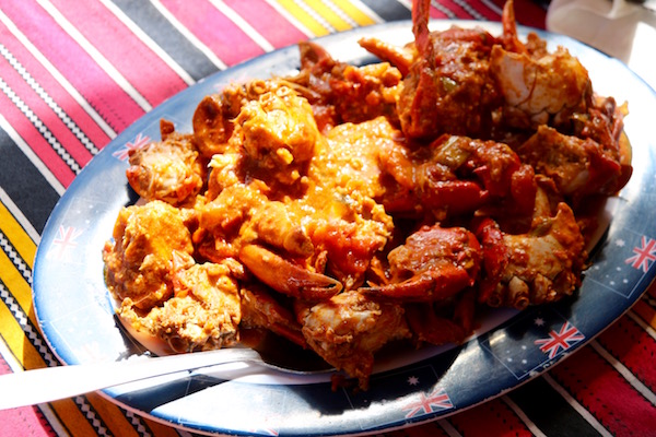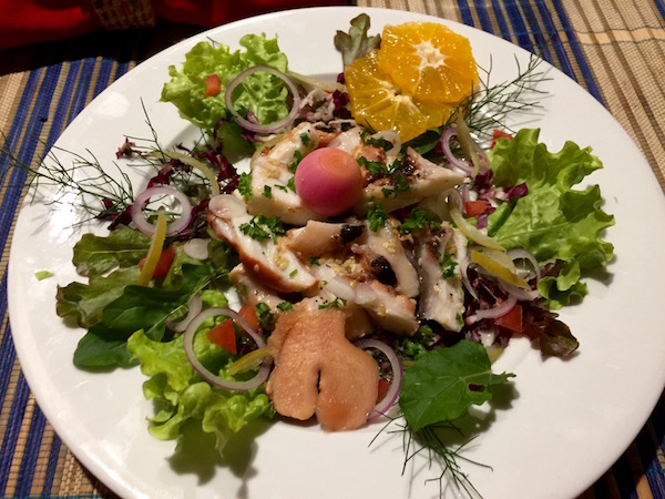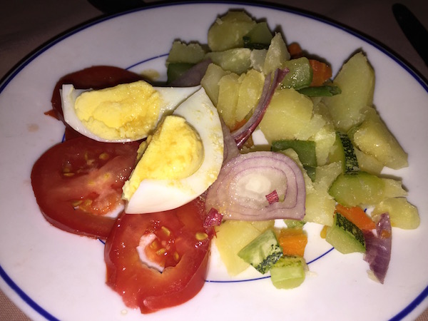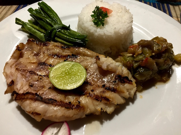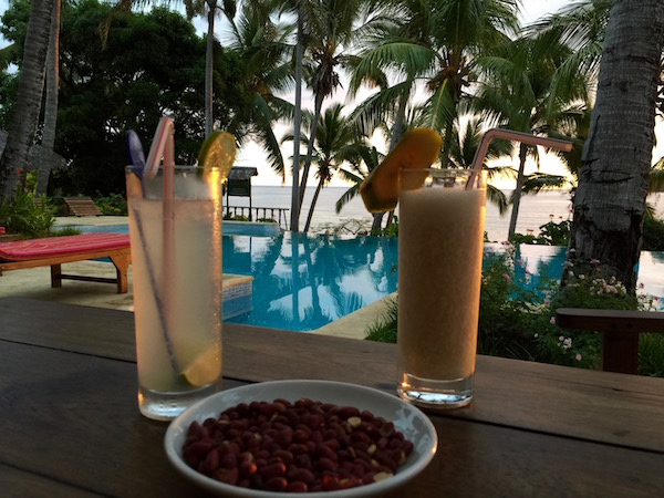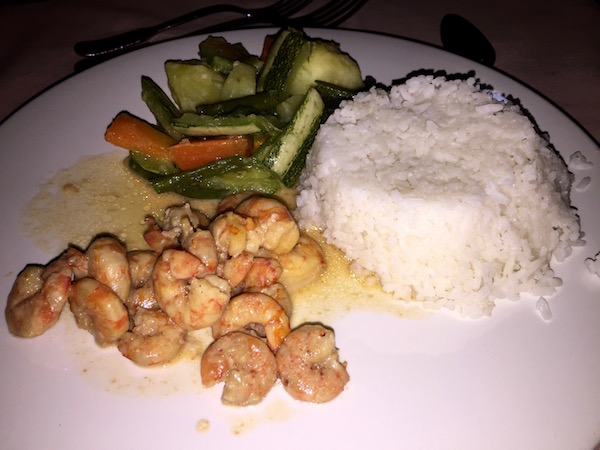Corriendo nos pusimos el traje de baño para bañarnos en el mar. Comenzaba a atardecer, nos adentramos en el bungalow, nos dimos una ducha y fuimos hasta el comedor del Lodge, donde nos ofrecieron una ensalada de patatas, huevo y habichuelas de plato principal, unas gambas en salsa con verduras y arroz blanco. Terminada la comida, nos vimos obligados a salir corriendo, porque los mosquitos nos estaban picando. Aunque llevábamos puesto el repelente eran aviones.