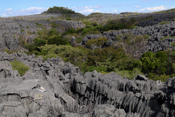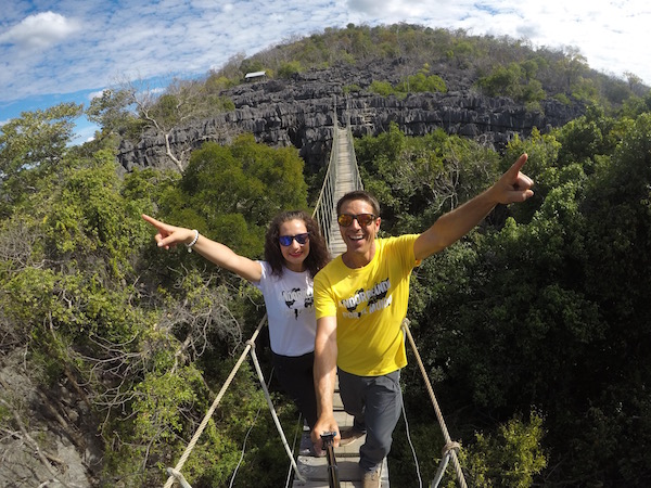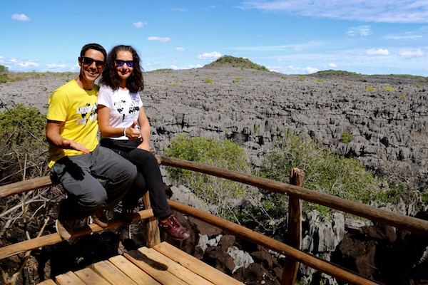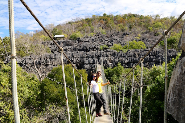 Sin darnos cuenta de repente nuestros ojos dejaron de ver un bosque tropical para encontrarse con el Mirador Tsingy Rary desde donde obtuvimos unas increíbles vistas de los Tsingys, rocas grises puntiagudas, afiladas que se han creado gracias a la erosión, caminamos por ellos, aunque resulta difícil y eso que hay un camino hecho por los visitantes hasta llegar y cruzar el puente colgante de acceso al tsingy de Benavony. Aquí debes tener cuidado, una torcedura de pie o caída te puede provocar una lesión o fractura. Hicimos una parada para comernos las frutas que nos habíamos comprado en un mercado, unas horas antes. Terminada la comida emprendimos el regreso a la entrada del parque.