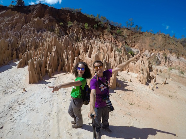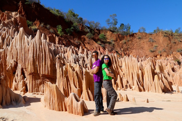 En la última parada bajamos del 4×4 y comenzamos a pie un pequeño descenso por el cañón, caminamos atravesando un pequeño río, hasta llegar donde están los Tsingys. Llamada “Chimeneas de hadas” son formaciones sedimentarias formadas por gres, de laterita y material calcáreo con tonalidades rosas y rojos. Se han erosionado con el paso del tiempo debido a las aguas de los torrentes y de las lluvias, y la erosión creada por los vientos alisios. Las fuertes lluvias o inundaciones pueden ocasionar un cambio en el paisaje de los Tsingys rojos cada año, deteriorando o rompiendo algunas partes y originando otras nuevas. Mapi, nos mostró fotografías de los Tsingys de un año para otro, y os podemos decir que cambian mucho. Están protegidos por la Unesco, porque se encuentran en peligro de desaparición. Es considerado como un paisaje sobrenatural y único en el mundo. Permanecimos un rato contemplando el lugar, tomando fotografías, grabaciones, etc. La entrada para extranjeros es de 10.000 ariary malgache por persona (2,67 € aproximadamente).