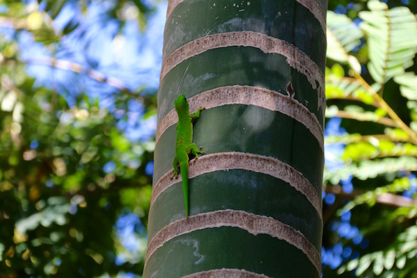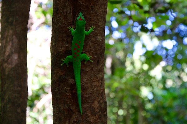 Muy cerca, en una palmera vimos de nuevo a gecko, una especie de pequeño lagarto, ¡recuerdas!, el que nos encontramos en el parque Nacional de Ankarana. Llamativo por su color verde intenso y lunares de color rojo.