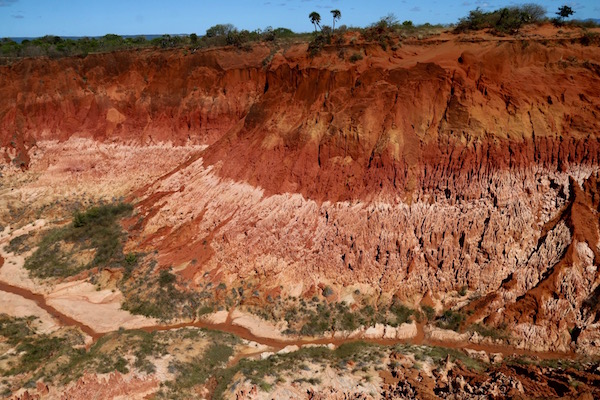 Esto fue todo por ese día, regresamos al hotel, nos fuimos hasta la habitación y cenamos lo que nos habíamos comprado el día anterior en el supermercado. Al día siguiente sonó el despertador a las 6:00 h de la madrugada, bajamos a desayunar al comedor y una vez listos, vino Mapi, a las 7:00 h para salir en el 4×4 hasta los Tsingys Rojos de Irodo. Se encuentran a 70 km de Diego Suárez. Para llegar a sitio ¡es un verdadero rally!, como nos decía Mapi. Se debe acceder con un vehículo 4×4, es una pista de arena totalmente llena de baches, hay que cruzar bosques, valles llenos de vegetación. Pudimos observar desde tres puntos diferentes los Tsingys. La primera vista desde lo alto del cañón, desde la cima de la colina tuvimos unas vistas panorámicas del mar y la reserva de Analamera.