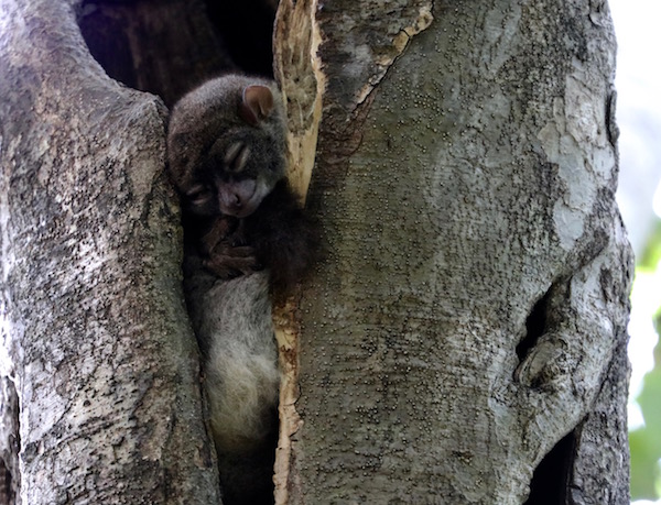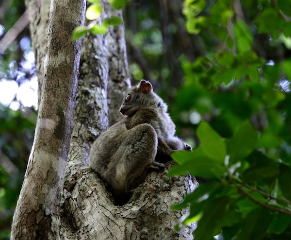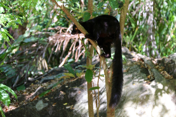 Vimos a un lémur saltador de cola roja, este animal es nocturno, se alimenta de hojas y algunas frutas. Pesan unos 800 gramos, viven en parejas. No lo encontramos dentro de la madriguera de un árbol, dormido. Unos metros más adelante nos encontramos con otro, ese con los ojos bien abiertos.