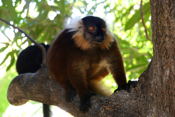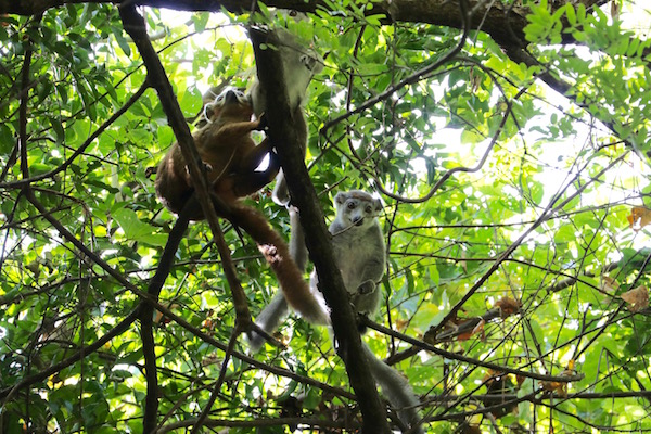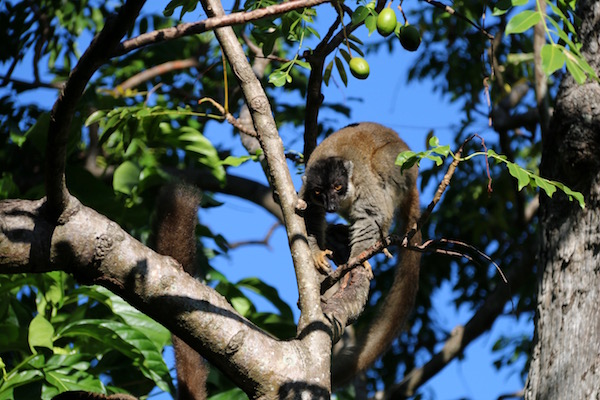 En los árboles nos encontramos un lémur pardo, existen varias variedades, los tamaños y pesos varían, tiene una longitud total con cola entre 45 a 60 cm, los adultos pesan entre 1,9 hasta 4,2 kg. Se alimentan de frutos y hojas. Hay poblaciones diurnas y nocturnas, viven en grupos de 5 a 15 miembros. Las hembras tienen una gestación de 146 días, dando a luz entre una a dos crías.