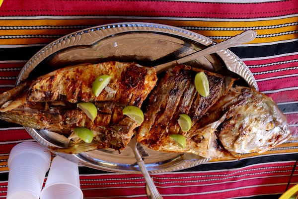 Emprendimos el descenso, por el camino pudimos ver la vida de los habitantes, niños jugando con piedras y caracolas, mujeres bordando manteles, etc. Llegamos hasta una zona habilitada para comer donde nos sirvieron una comida que fue una bandeja de pescado asado, cangrejo en salsa, unas brochetas de pescado y un cuenco de arroz.