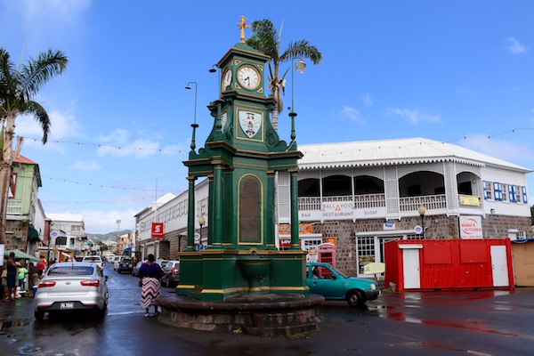 Al día siguiente el barco no llevó al Puerto de Basseterre hasta las 12:00 h, almorzamos antes, para luego bajar y comenzar a visitar la ciudad de Basseterre (San Cristóbal y Nieves) ¡recuerdas!, esta ciudad la visitamos en días anteriores en la primera semana de crucero, nos quedaron lugares pendientes debido a la lluvia que nos calló encima. En la terminal del puerto cogimos un nuevo callejero en el puesto de información turística, el otro que teníamos quedó totalmente mojado con la lluvia. Horas antes había llovido en Basseterre, las calles estaban mojadas, cruzábamos los dedos para que nos lloviera. Salimos del puerto y unas calles más arriba nos llevaron al Memorial Berkeley, el Circo es una rotonda de pequeñas dimensiones de estilo victoriano donde hay un reloj colocado en el centro con cuatro caras.