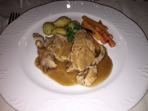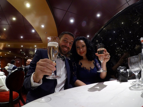 Al ser la cena de Nochevieja, en la carta había platos más elaborados, nosotros nos pedimos como entrante sopa de cebolla y de primer plato langosta con puré de patatas, de postre un plato de fruta, y brindamos con una copa de champán. Acabada la cena subimos a la cubierta a la zona de Aqua Park, donde están las piscinas, desde allí pudimos ver la cuenta atrás de la llegada del nuevo año en una pantalla gigante. Como cotillón nos repartieron un matasuegras a cada uno, más tarde comenzó el baile en la Liquid Disco en el puente 16. Bueno, movimos un rato el esqueleto y nos fuimos a descansar que al día siguiente nos esperaba un día de visitas.