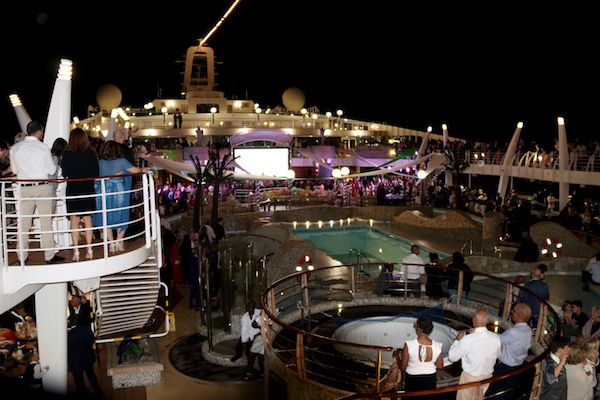 Subimos un rato a la cubierta de la piscina, en el Aqua Park, donde pudimos ver que estaban impartiendo clases de salsa los instructores de baile Raymond y Raquel. Volvimos al camarote esa noche teníamos la noche del cóctel de gala desde las 18:00 h hasta las 19:00 h, en los salones de los puentes 5, 6 y 7, en el puente 7 a partir de las 20:30 h hasta las 21:00 h, había la oportunidad de conocer al capitán Stefano Aiello, (tomarte una fotografía con él), a los oficiales y los responsables de otros departamentos.