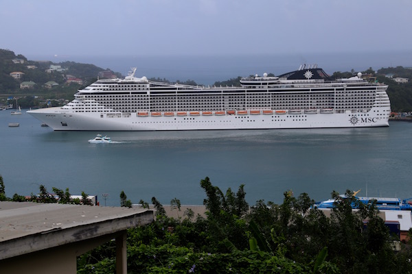 Por último hicimos esta parada donde pudimos contemplar un Arco Natural creado en las piedras de un acantilado, formado por la madre naturaleza ¡Cómo nos gustan los paisajes que se crean tallados en los acantilados! Por la carretera pudimos obtener unas vistas del puerto y de nuestro crucero, la naviera MSC Fantasía, llegamos a la puerta del puerto marítimo de Castries, bajamos de la furgoneta y embarcamos en el barco a las 17:10 h. Otra vez no llegábamos para el almuerzo o buffet y estaban cerrados el restaurante y el buffet, tuvimos que ir a comer al buffet L’Africana y Zanzíbar donde comimos ensaladas y frutas. Como podéis leer y ver, la vida del viajero también es dura.