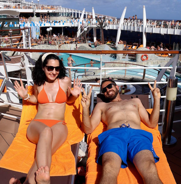 Volvimos al barco, almorzamos, pedimos como entrante una ensalada tropical, de plato principal una lasaña de verduras, de postre un plato de fruta. Acabada la comida, cogimos las toallas de la playa del camarote y pasamos el resto de la tarde dándonos un chapuzón en las piscinas de la cubierta, acompañados de la animación que ofrecieron clases de aerostretching, de merengue, etc.