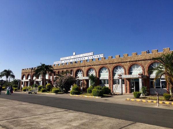 Volvimos al hotel para descansar. Al día siguiente nos levantamos, yo Elisabeth, fui a darme una ducha y me quede en las manos con el grifo, comencé a secarme el pelo y la luz se fue del hotel. ¡Vamos!, tenía un día redondo, recogimos todo, bajamos a desayunar al comedor del hotel, donde nos ofrecieron un desayuno tipo buffet, nuevamente la fruta resultaba difícil encontrarla, pedí que me hicieran una tortilla, los minutos pasaban y no me la servían, decidí volver a la habitación a terminar de secarme el pelo. Baje al comedor, ya estaba la tortilla puesta en la mesa, me la comí, una vez con energías repuestas, hicimos el check-out, subimos en la furgoneta para trasladarnos hasta el Aeropuerto de Gondar. A la entrada al aeropuerto subió un policía para comprobar el pasaporte, una vez en el aeropuerto tuvimos que pasar un detector de metales, fuimos a facturar el equipaje con la compañía aérea Ethiopian Airlines, cuando llegamos hasta la puerta de embarque nuevamente tuvimos que pasar un control de seguridad, esperamos al comienzo del embarque. El viaje tuvo una duración de 30 minutos. El billete de avión nos costó 62 € por persona.