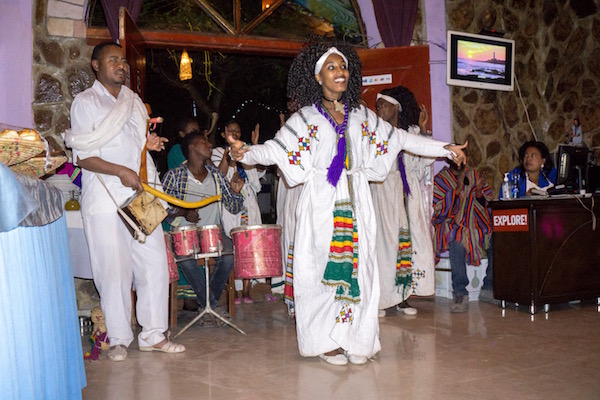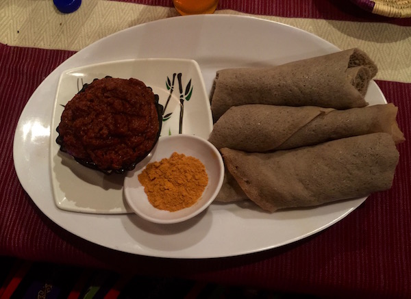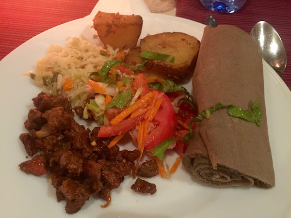 Terminada la visita regresamos al hotel, nos dimos una ducha y nos fuimos a cenar al Restaurante Four Sister, considerado como uno de los mejores de la zona, ofrece comida etíope, africana y europea. Por la noche hay espectáculos de música y danza tradicionales del país. Se puede comer a la carta o buffet. Nosotros cenamos buffet donde ofrece una gran variedad en diferentes carnes, salsas, repostería, etc. Sergio, probo la Tere Segá es carne cruda, acampada de especias, servida con injera y mismita, una especia en polvo. Pagamos por el buffet más la bebida, dos botellas de agua un total de 500 birrs (15,70 € aproximadamente). La dirección es Bahind The Public Library.
