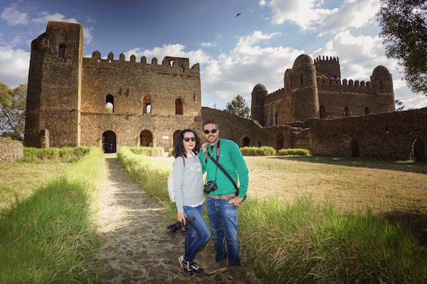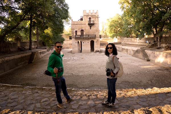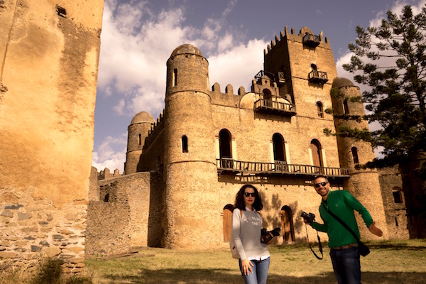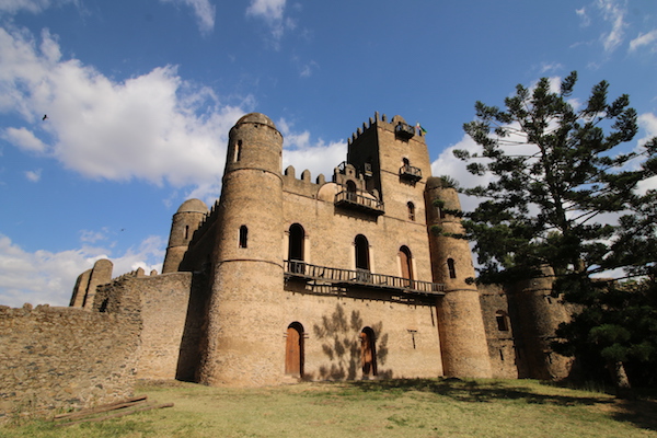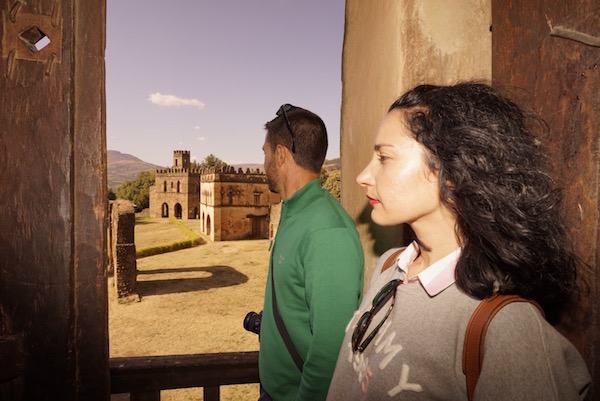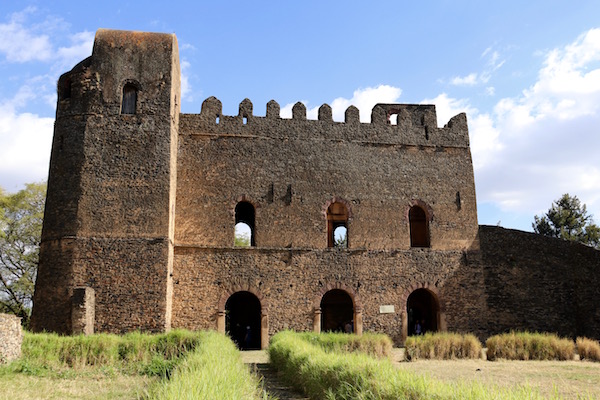 Visitamos el Castillo de Fasilidas fue construido en el 1640 edificio de base rectangular, su estilo tiene influencia portuguesa, morisca, aksumitas, e india, rodeado en sus cuatro equinas por cuatro torreones, tiene una altura de 32 metros, siendo el edificio más antiguo. La planta principal era donde están el salón comedor y zona de recepción, en la primera planta fue la sala de oración, celebrándose en la azotea ceremonias religiosas donde Fasilidas se dirigía a sus vasallos (súbditos). En la segunda planta se encontraban los dormitorios y encima, la atalaya, ofreciendo unas vistas hasta el lago Tana. Atrás de la fortificación están varios inmuebles en ruinas, como la cocina, una cisterna y unos baños de vapor.