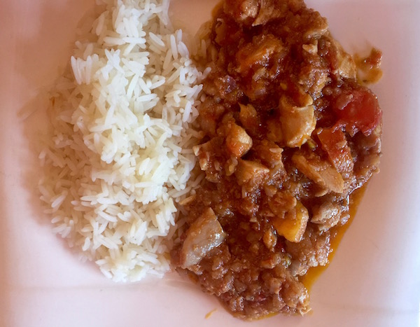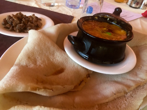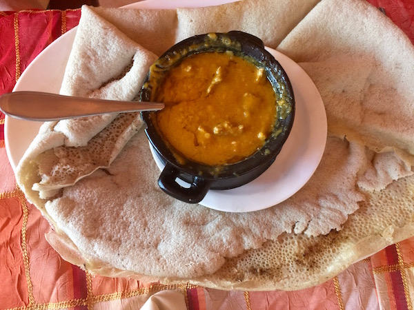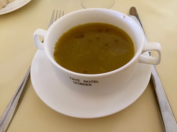 Almorzamos en el propio hotel donde pedimos como entrante una sopa de verduras, de plato principal shiro, guiso con garbanzos, verduras, acompañado de carne e injera, para el otro un pincho de pollo, ¡vamos!, más que un pincho, era carne en salsa, de postre una porción de papaya, de bebida una coca cola y una botella de agua mineral. Pagamos un total de 312 birrs (9,73 € aproximadamente).