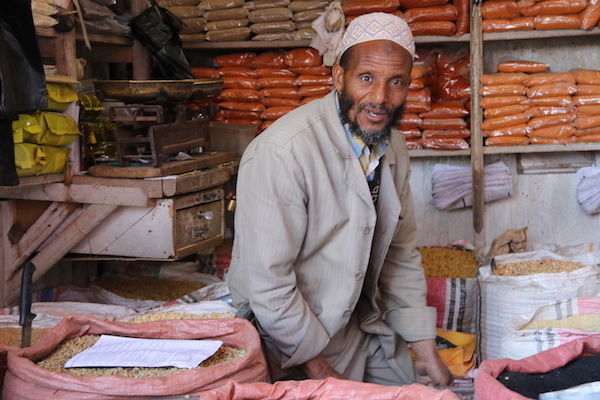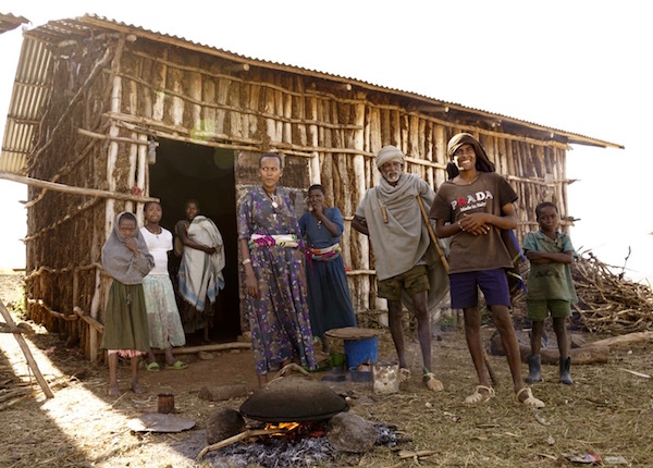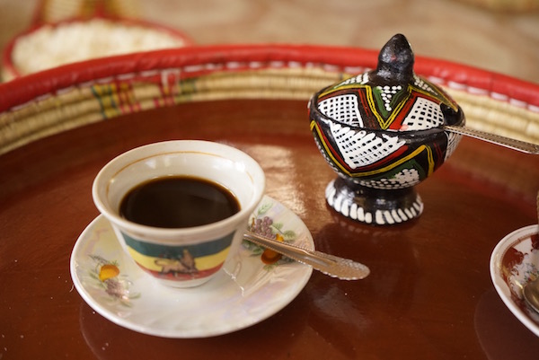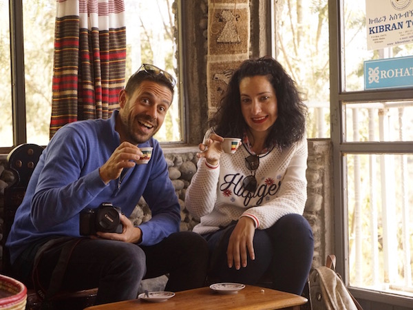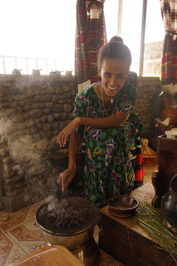 Terminada la comida salimos a dar una vuelta por las calles de Lalibela, unos lugareños nos invitaron a su casa, para presenciar la ceremonia del café, denominada en etíope Bunna, es una tradición, es un rito ancestral, que está presente diariamente en la vida de los etíopes, es una reunión familiar o social. Como podéis saber, el café etíope es muy famoso en el mundo por ser considerado uno de los mejores. Vimos los pasos de preparación de la ceremonia del café, lo primero es lavar los granos de café verde, más tarde son colocados en una sartén para ser tostados, también suelen quemar incienso y sándalo, para crear un ambiente acogedor, en el pasado era una forma de ahuyentar a los mosquitos. Cuando los granos son tostados, el café es molido en un mortero, luego se vierte dentro de un recipiente (una jarra de barro) llamada “jebena” con agua hirviendo. Hay que tomar tres veces, la primera taza es más fuerte, la segunda es algo menos intensa y la última es la más suave. Se sirve empezando por el invitado, continuando por los hombres de la casa y finalizando en las mujeres. Al terminar la ceremonia y después de haber probado el exquisito café, decidimos marcharnos, despidiéndonos de ellos, le dejamos una propina de 200 birrs (6,24 € aproximadamente).