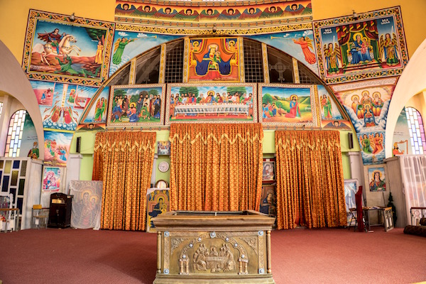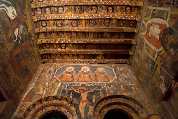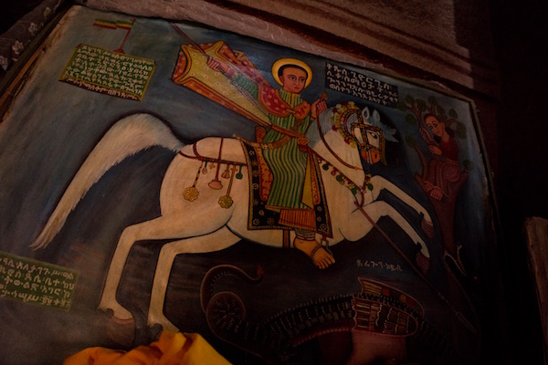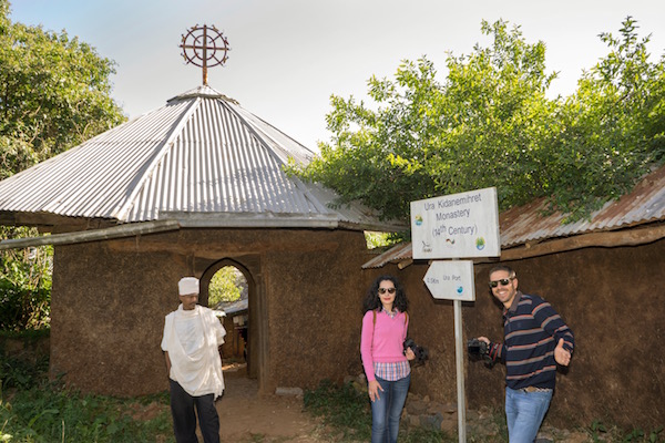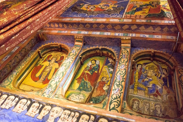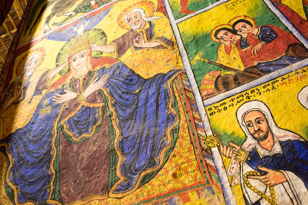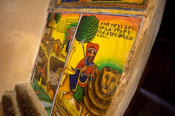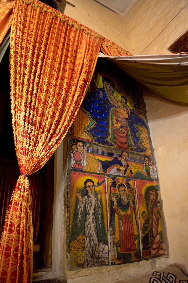 Volvimos a subir nuevamente al barco y la siguiente parada fue en la Iglesia del Monasterio de Ura Kidane Mehret se construyó en el siglo XIV, sus murales fueron pintados por diferentes artistas entre los siglos XVIII y XX. Siendo el panel de los Santos a caballos, el más importante por ser el más antiguo del templo y del segundo estilo Gondarino. La entrada nos costó 100 birrs por persona (3,15 € aproximadamente) y otros 100 birrs (3,15 € aproximadamente) más por hacer grabaciones de vídeo. Abierto desde las 7:00 h hasta las 18:00 h. La visita de esta segunda resulta más fácil llegar a pie a ella que la anterior, sobre todo para personas con movilidad reducida.
