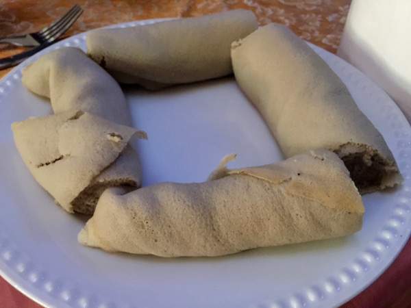 ¡Tocaba almorzar!, fuimos hasta el Restaurante Pizzería Kalia donde ofrece comida etíope, italiana y americana, probamos por primera vez la injera, ¿Te estarás preguntando que es eso?, es una base de harina, elaborada con tef (es un cereal autóctono de Etiopía) es como si fuera un pan fino que muchas veces se sirve enrollado, es un producto típico nacional. Tiene un sabor amargo, con un toque agrio, que se puede suavizar añadiéndole una salsa picante. Pedimos un plato para cada uno de carne de ternera con verduras, de bebida una coca cola, una botella de agua mineral y de postre dos cafés solos. Pagamos un total de 330,41 birrs (10,40 € aproximadamente). En el precio ya estaba incluido la tasa y el 10% de servicio de mesa. Situado a unos metros del museo nacional de Etiopía.